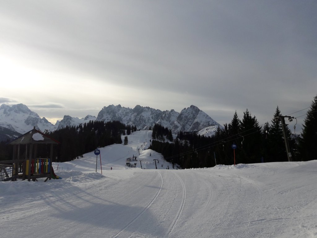 I needn’t have worried. Martin, courteous and considerate as ever, had picked the perfect slope for me. It was on the Hornspitze which is in the ski area Gosau (also known as Dachstein West). With the Gosau Kamm (a mountain range that looks like an upside down comb, similar to the Dolomites in structure) and The Dachstein (on my pictures to the left of the Gosau) ‘my slope’ was very high up so I had that amazing feeling of skiing on top of the world. Incredibly however, my slope was a blue run. Beautifully blue. In fact, it was probably a nursery slope. Already very happy about the fact I could actually fit into my ski pants, I got my skis on, no problem. But then, rather inevitably, the fear kicked in. OK, it wasn’t a big slope but I still had to get down it and what about the button thing lift to get back up again? Could my legs actually cope with all this? Which muscles was I going to use? I could not remember……